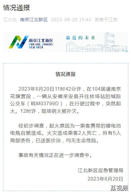 据南京江北新区官微消息,2023年8月20日11时42分许,在104国道南京花旗营段,一辆从安徽来安县开往林场站的城际公交车(皖M03799D),在行驶过程中,突然起火。12时许,现场明火被扑灭。